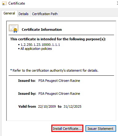Installing the certificate of "Groupe PSA" Certification Authority in Internet Explorer